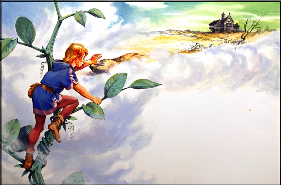 Jack tò mò leo lên trên cây. Leo mãi, leo mãi, cậu leo không ngừng. Leo đến hết ngày thì Jack đến tận trời. Trước mắt Jack lúc này là một khung cảnh kỳ diệu như trong mơ. giữa những đám mây trắng xóa là một tòa lâu đài nguy nga lộng lẫy. Jack mệt vì leo quá lâu, và cũng đói bụng vì cậu chưa ăn gì từ tối hôm qua, cậu gõ mạnh vào cánh cửa
