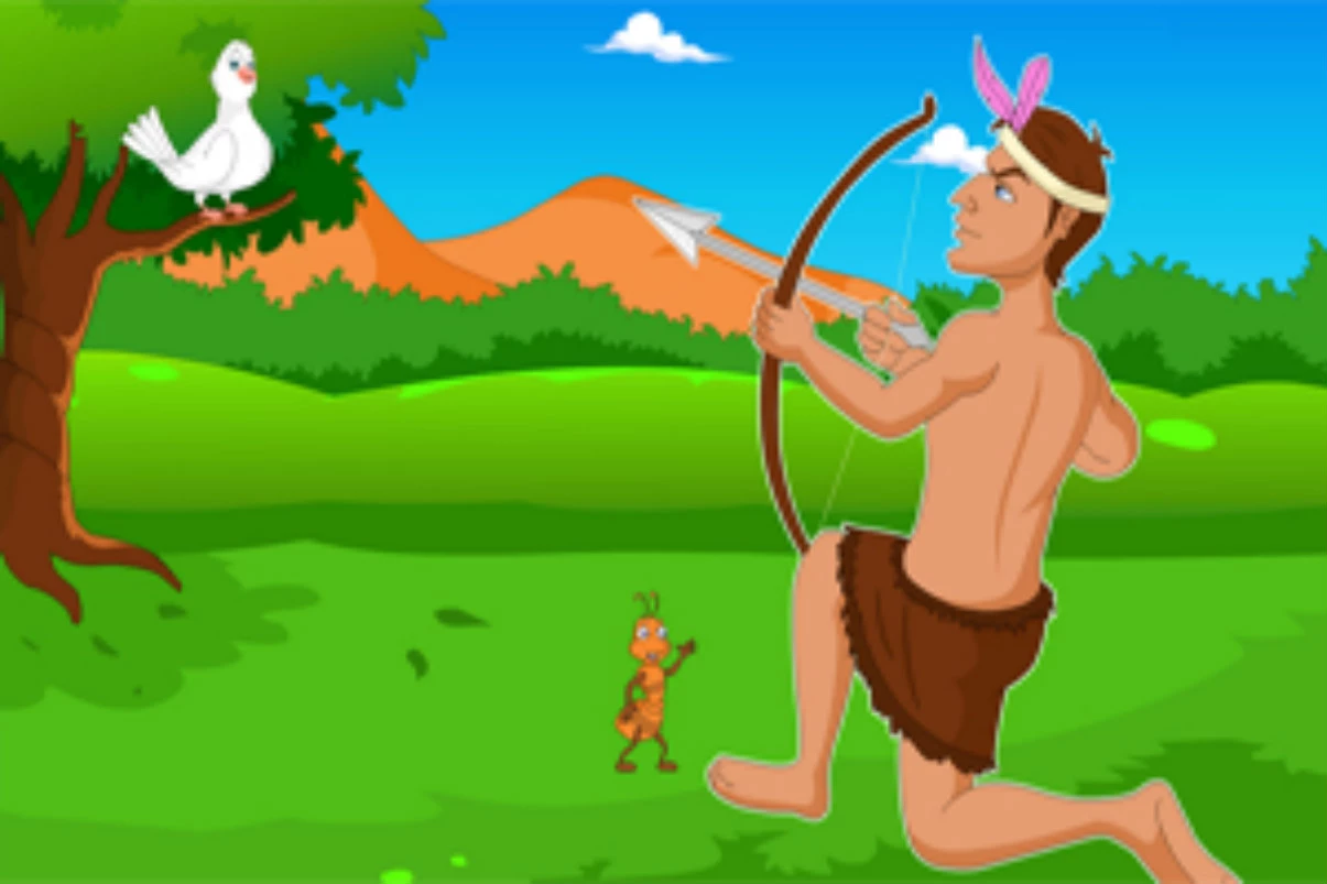 Ở ngoài một ngôi làng nọ, có một cây đa rất lớn. Phía trên cây, có nhiều loại chim khác nhau làm tổ. Còn dưới những tán lá, khách bộ hành thường ngồi lại nghỉ ngơi sau khi đi một chặng đường dài. Một ngày nọ, có một người thợ săn đến khu vực này và nhìn thấy trên cây có rất nhiều chim. Anh ta tìm cách đặt bẫy những chú chim này, nhưng một con quạ đã biết được điều đó và cảnh báo cho những con chim khác.