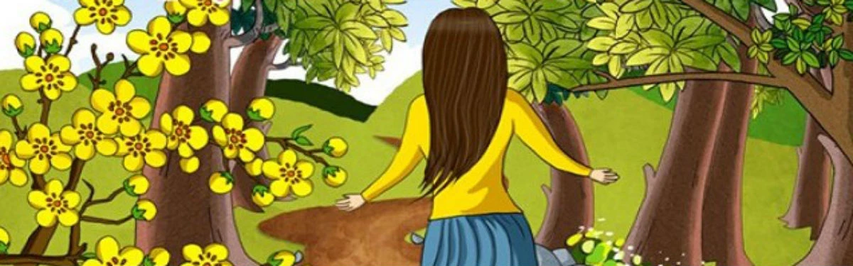 Người mẹ liền giã nghệ nhuộm cho con một màu vàng thật tươi. Ngày lên đường, cô bé mặc chiếc áo vàng, nhìn càng khỏe, càng đẹp. Cô nói với mẹ và chị: