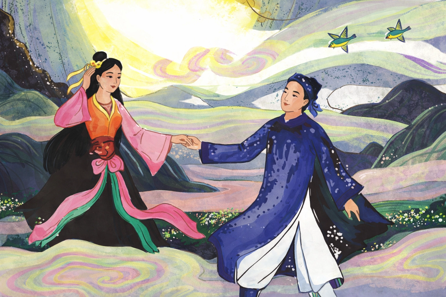 Không ngờ người đẹp lại là người cùng quê, Từ Thức càng thêm niềm nở. Hai người men theo lối cổng chùa, vừa đi vừa ngỏ ít lời lâm sự. Trước khi từ giã, nàng còn không quên mời chàng đến chơi nhà nếu có dịp về thăm quê.