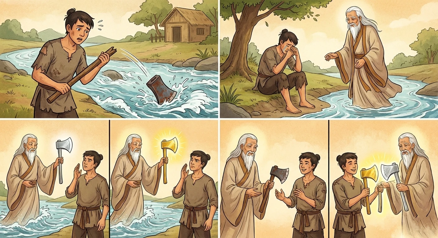 Ngày xưa, có một chàng tiều phu nghèo đi làm thuê cho một phú ông. Một hôm, như thường ngày chàng tiều phu vác rìu vào rừng để đốn củi, trong lúc đang chặt củi cạnh bờ sông thì chẳng may chiếc rìu của chàng bị gãy cán và lưỡi rìu văng xuống sông. Vì dòng sông nước chảy quá xiết nên mặc dù biết bơi nhưng anh chàng vẫn không thể xuống sông để tìm lưỡi rìu.
