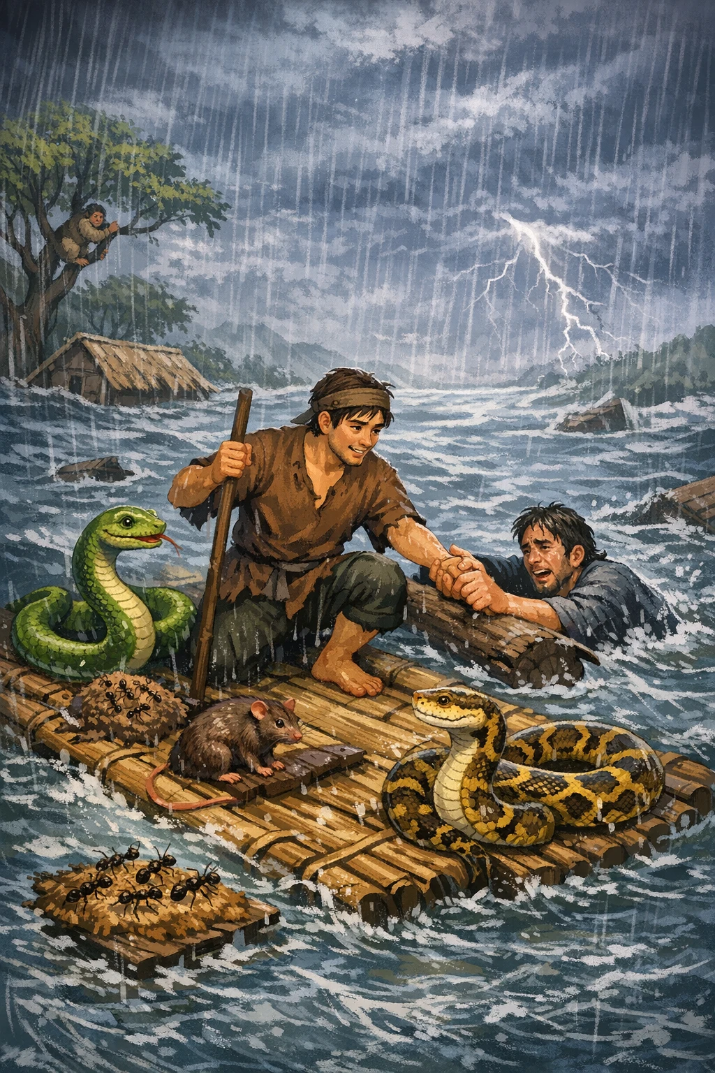 Anh chàng lại quẳng rắn xuống nước. Lần thứ ba cũng lại con rắn đó mắc lưỡi câu. Lần này hắn giận lắm không thả rắn xuống nước nữa mà nắm lấy cổ rắn định mang đi giết...
