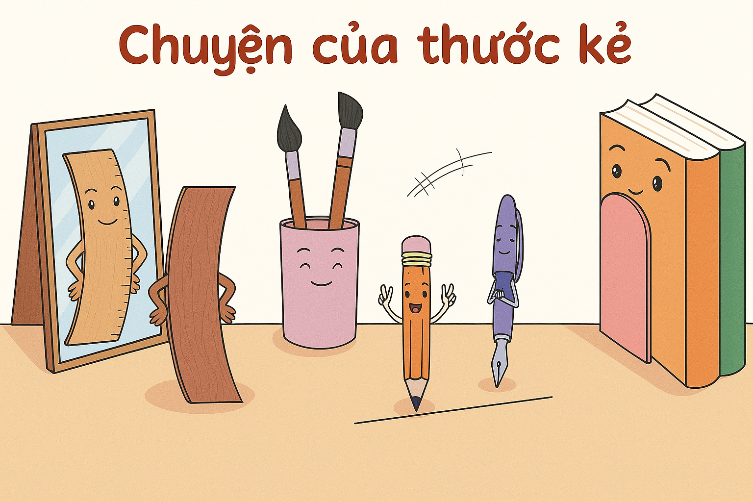Trong cặp sách, thước kẻ làm bạn với bút mực và bút chì. Chúng sống cùng nhau rất vui vẻ. Mỗi hình vẽ đẹp, mỗi đường kẻ thẳng tắp là niềm vui chung của cả ba.