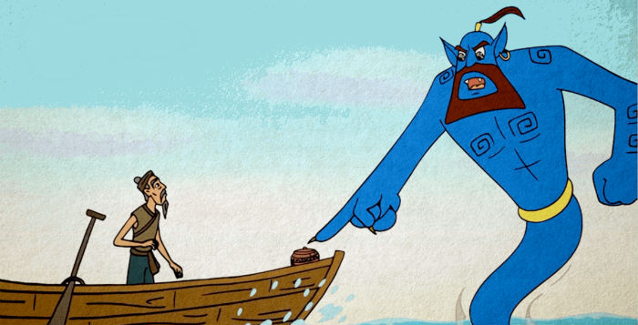 Ngày xưa, có một bác đánh cá đã cao tuổi. Một hôm bác ra biển quăng lưới, kiên nhẫn đợi cho lưới sa xuống tuận đáy biển mới kéo lên. Nhưng lần nào bác cũng chỉ cất lên toàn những thứ đáng vứt đi. Ngán ngẩm, bác thả lưới lần cuối cùng trong ngày. Mẻ này, bác với được một chiếc bình to bằng đồng, miệng gắn chì bịt kín. Bác mừng lắm, tự nhủ: “Cái bình này mang ra chợ bán được khối tiền đây!”