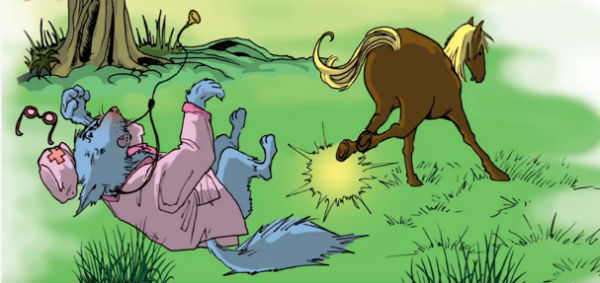 Khi thấy vừa tâm, ngựa tung vó đá một cái trời giáng khiến Sói bật ngửa người bốn cẳng bơi bơi giữa trời. Kính vỡ, mũ văng xa, vành móng sắt va đúng mõm làm gãy mấy chiếc răng và đổ máu mồm, máu mũi. Ngựa nhảy ra xa đứng hí dài.
