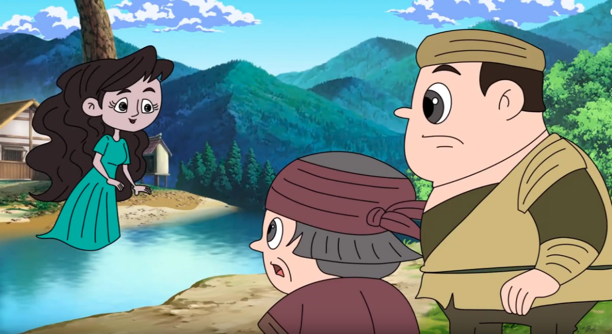 Xưa kia, trong một vùng cằn cỗi dưới chân núi, có một bà góa nghèo sống cùng ba người con trai. Người con cả là một tên vô tích sự, người con thứ hai chẳng hơn gì, duy chỉ có người con út là thương người và siêng năng, thường cố sức mình giúp mẹ. Bà mẹ dệt suốt ngày, dưới những ngón tay khéo léo của bàn ở ra muôn bông hoa đẹp, vô số chim chóc và đủ loại muông thú. Bà mang những tranh gấm ra chợ tỉnh gần đấy và đổi lại đủ tiền nuôi các con cùng bản thân. Người con út thường vào rừng kiếm củi, nhưng hai anh lớn thì lười biếng chỉ nằm ườn sưởi nắng chờ mẹ cho ăn.