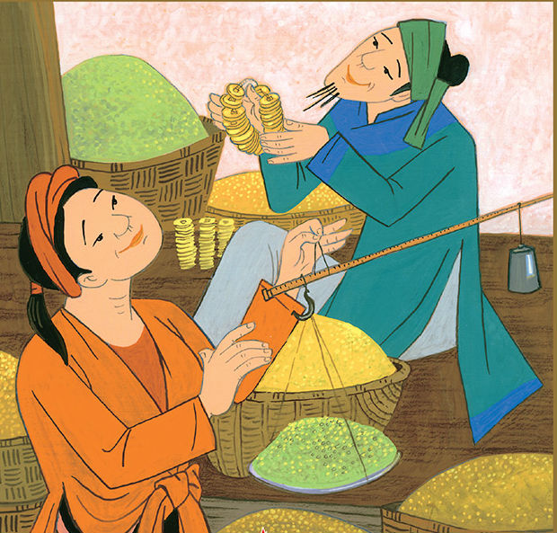 Ngày xưa, có một nhà làm nghề buôn bán, gian tham chế ra một cái cân cán rỗng, trong đổ thủy ngân, hai đầu bịt đồng, không ai biết. Khi cân hàng bán cho người ta thì dốc cán về đằng móc, còn khi cân hàng mua của ai thì dốc cán cân về đằng quả. Như vậy một cái cân vừa nặng vừa nhẹ được, và bao giờ phần lợi cũng về mình.
