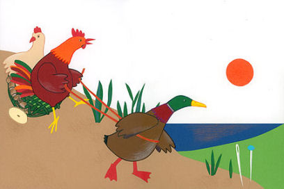 Thế là vịt xông tới, lấy mỏ cạp gà trống, nhưng gà trống đâu có chịu thua, nó mổ, đá túi bụi vào người vịt, đau quá vịt xin thua và đành chịu kéo xe cho gà để đền tội.