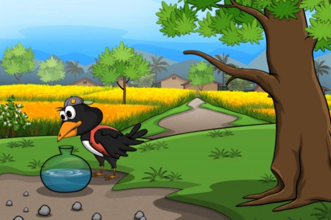 Một con quạ đang khát nước. Nó bay rất lâu để tìm nước nhưng chẳng thấy một giọt nước nào. Mệt quá, nó đậu xuống cành cây nghỉ. Nó nhìn quanh và bỗng thấy một cái bình ở dưới một gốc cây.