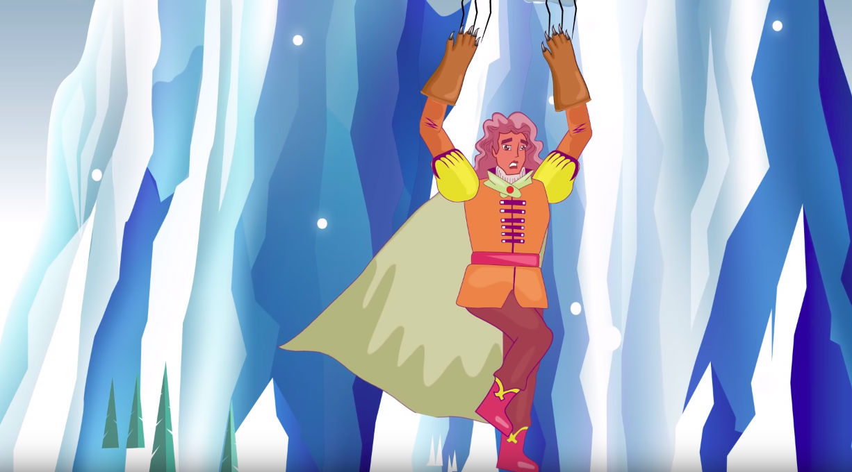 Rojo và Fedma lên đường đi tới xứ người Thụy Điển. Họ đi nhiều tuần rồi nhiều tháng. Một hôm, họ tới chân núi băng. Đường lên núi rất khó khăn và hai người cực nhọc lắm mới lên tới đỉnh, nơi dựng băng cung. Một lối đi dài dẫn tới cổng, hai bên có những tảng băng cao có dạng người. Cổng mở rộng. Họ vào một sân rộng có những khối băng lớn giống hình dạng của ngựa. Rojo giải thích cho Fedma biết đó chính là ngựa của những người cầu hôn Tindir Gudrun. Nữ phù thủy đã biến chúng, cũng như chủ chúng, thành những tảng băng.