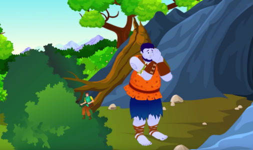 Tính tò mò nổi lên, anh thợ may cứ thể thẳng tiến về phía núi. Khi tới gần, anh ta há hốc mồm, trợn tròn mắt. Cái tháp ấy lại có chân, chỉ nhún mình một cái nó đã nhảy qua một ngọn núi cao vách dựng đứng kia. Và trước mặt anh thợ may giờ đây là một người khổng lồ lực lưỡng, giọng nói vang như sấm đánh từ tứ phía: