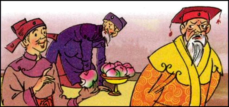 – Muôn tâu bệ hạ, hạ thần có bụng tham sinh, sợ số chết non, thấy quả gọi là quả “trường thọ” thèm quá tưởng ăn vào được sống lâu như Bánh Tổ, để được thờ nhà vua cho tận trung. Không ngờ nuốt chưa khỏi mồm mà chết đã đến cổ! Hạ thần trộm nghĩ nên đề tên quả ấy là quả “đoản thọ” thì phải hơn, và xin nhà vua trị tội đứa dâng đào đẻ trừ kẻ xu nịnh.
