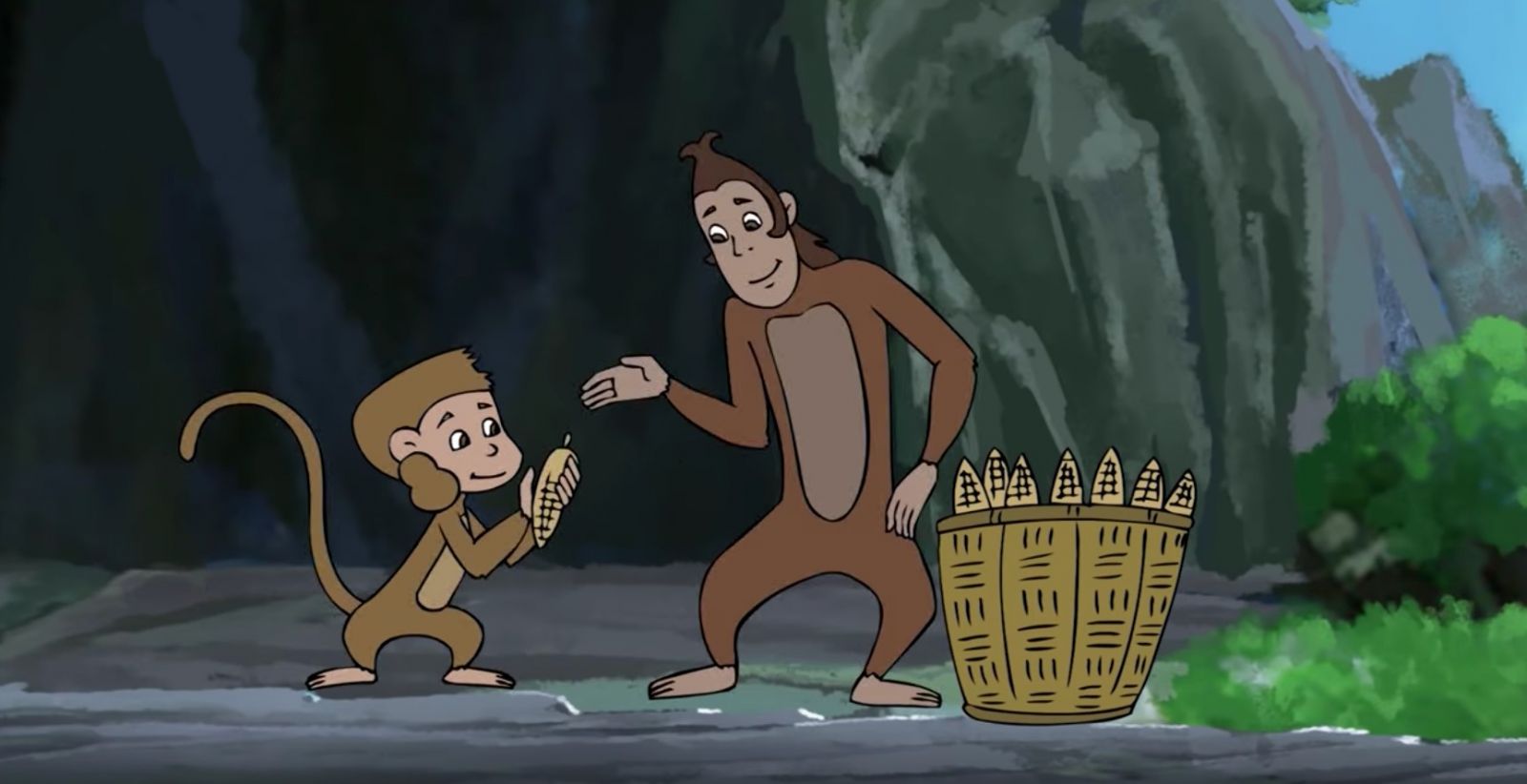 Đàn khỉ nghe thấy rất có lý, bèn đưa số hạt ngô ít ỏi cho người rồi chúng bảo nhau đi tìm cái ăn khác.