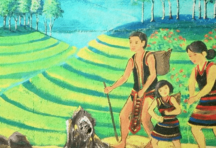 Hai vợ chồng gặp nhau, vui mừng khôn kể xiết. Vợ cởi áo đưa chồng đóng khố, rồi họ dắt tay nhau tìm đất phát rẫy gieo lúa, trồng ngô. Về sau ho sinh con đẻ cháu gọi là người Ba Na hiện nay. Còn người anh ở đồng bằng, sinh con đẻ cháu là người Kinh.