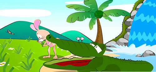 Chạy một lát, thỏ gặp một con sông rộng. Thật là cùng đường vì chả có cách nào vượt qua cả. Trong khi bối rối thì vừa gặp một con cá sấu đang ghếch mũi lên bãi sông, miệng thở phì phì. Thỏ tươi cười gọi to: