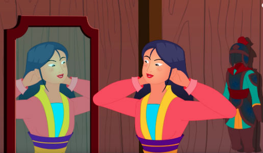 Nàng Landja đang ngồi chải mái tóc dài màu hung trên bậc cửa. Hoàng tử lặng lẽ ngắm nàng, chàng nín thở, sững sờ trước vẻ đẹp vô cùng diễm lệ của nàng. Đột nhiên, nàng Landja ngẩng đầu và ánh mắt nàng bắt gặp Ahmad, nàng nói: