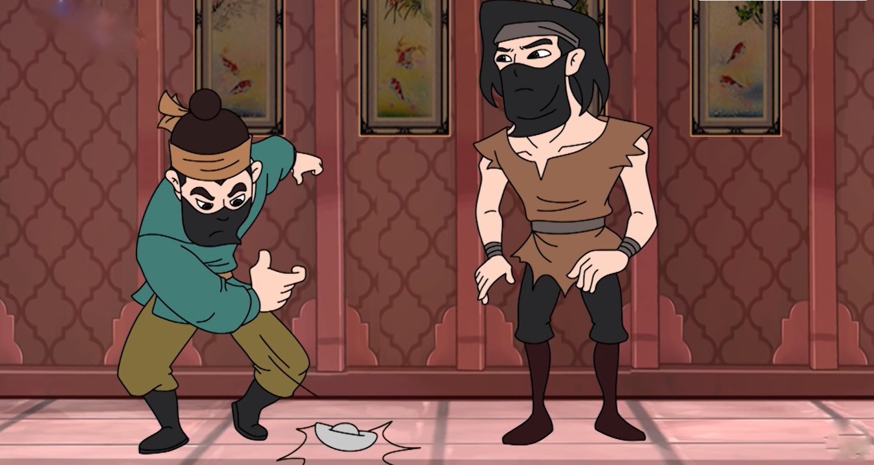 Lát sau, hai tên cướp vào kho, khoắng sạch mọi thứ, còn nhà vua thì đứng canh cho chúng hành động. Lúc chúng bước ra và định chuồn ra phố, nhà vua bảo: