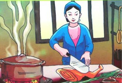 Ít lâu sau, bà ta sửa một lễ cúng Phật tại nhà mình rồi mời hòa thượng và các sư chùa đó đến tụng kinh. Theo lệ thường, trước khi ra về chủ nhân phải làm bánh tặng họ ăn đường. Để làm nhục bọn sư bất lương, bà ta giết một con chó lấy thịt băm nhỏ với các thứ rau thơm làm nhân bánh. Sau bữa cơm chay, bà ta đem bánh do tặng mỗi người một chiếc. Đoán được mưu mẹo của người đàn bà, vị hòa thượng dặn các nhà sư cầm bánh về chứ đừng ăn. Họ đều vâng lời, duy chỉ có một nhà sư là quên mất. Dọc đường thấy bánh thom ngon, sư ta bèn bóc ăn kỳ hết. Những người khác khi đưa bánh về biết là nhân thịt chó đều quẳng cả vào gốc cây bồ đề ở trước chùa.