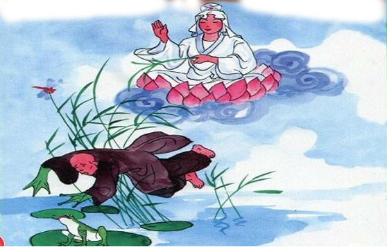 Thế là chuyến đó Phật bà Quan âm không được hài lòng. Giận vì hòa thượng đã thiếu kiên trì trước sức cám dỗ của “thị dục”, mà đã thế thì thanh danh cũ đâu còn đáng đếm xỉa nữa, nên Phật bà đã nắm lấy cổ hòa thượng vứt ngay xuống sông như người ta vứt một cái rác. Thế mà Phật bà vẫn chưa cho là đáng tội, nên còn bắt hóa làm loài nhái là một loài động vật hạ đẳng. Cũng vì thế mà người ta nói rằng ngày nay dòng dõi của loài nhái vẫn còn giữ cái thói quen của tổ tiên, ví dụ khi chúng bị chặt đầu, chúng vẫn chắp hai chân trước lại với nhau như người đang vái.