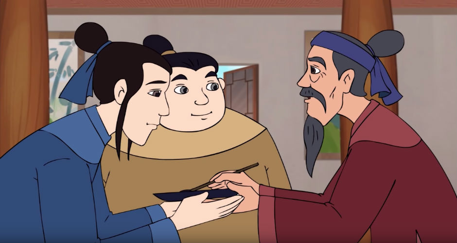 Cụ đồ mừng rỡ chạy lại án thư bê cái nghiên mực lớn còn đầy mực và cả quản bút lông của mình thường dùng, đưa cho họ. Hai anh em đỡ lấy rồi cả ba người cùng tiến ra bờ sông. Đến nơi họ xắn ống tay áo rồi sau đó em bưng nghiên mực, anh cầm quản bút nhúng mực vẩy lên trời nhiều lần. Đoạn họ vứt cả nghiên lẫn bút xuống nước, cúi vái cụ đồ rồi biến mất.