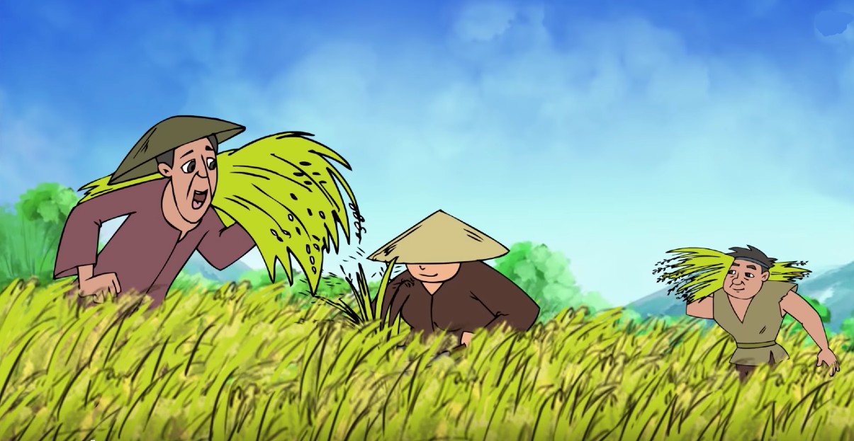 Tan cơn mưa, vua Hùng và các già làng như tỉnh giấc mộng, nhìn thấy ngay trước mắt mình một hạt lúa thần thật to bằng chiếc thuyền con.
