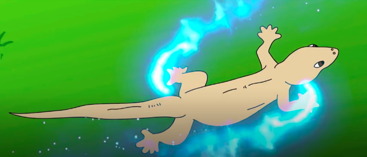 Thằn lằn rình cho hai vợ chồng Lươn đi khỏi, liền đến lấy trộm chân của Lươn, rồi chia nhau mỗi con bốn cái đi vào lạch bạch ra dáng lắm.