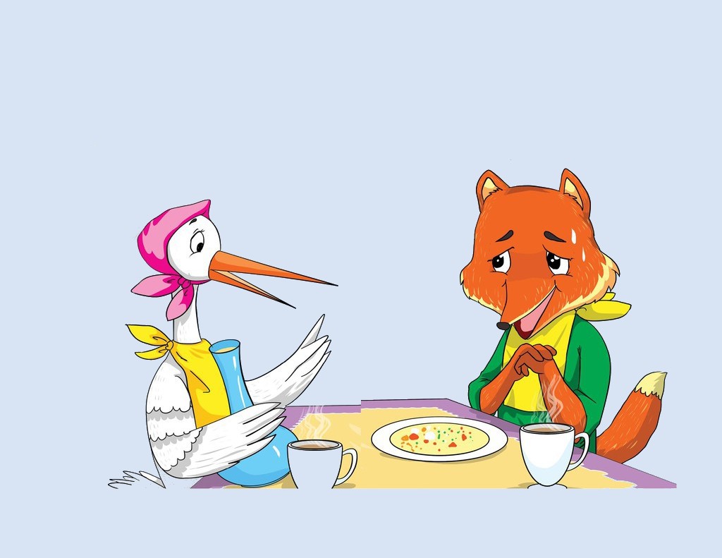 Tối hôm đó, chị cò vui vẻ tới nhà cáo như lời mời. Cáo mời cò vào nhà và bưng ra hai bát súp. Nó múc súp ra hai cái đĩa rất là nông!