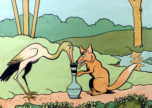 Khi Cò mời Cáo đến nhà mình ăn tối. Đầu tiên, Cò bưng ra một lọ thức ăn cao cổ. Cáo nhìn thấy nghĩ thầm: Ồ, hóa ra Cò định chơi khăm lại mình. Nhưng sau đó Cò quay vào bếp và bưng ra một đĩa súp là phần của Cáo. Khi hai con vật đã ăn xong bữa tối ngon lành, Cáo rất ngạc nhiên, nó hỏi Cò: