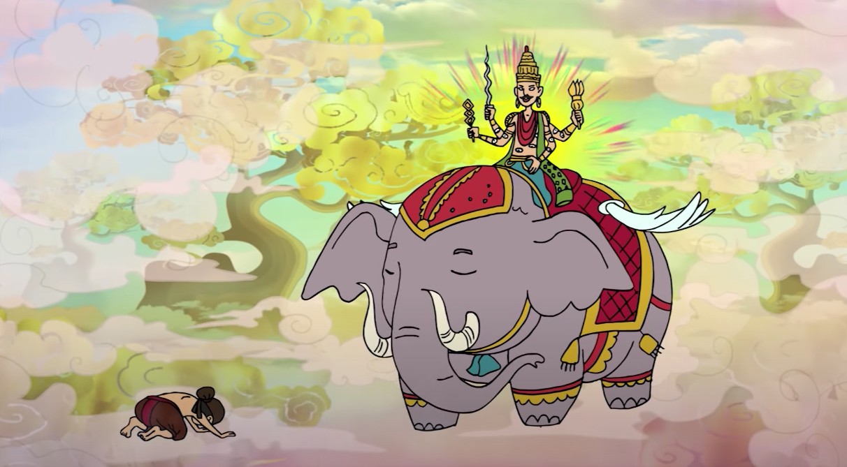 Khi thần Triệu Voi dẫn đàn voi khổng lồ xuống phá phách làng bản, mới đi đến gần sông Mê Kông đã bị anh hai dùng sức nước phun vào đàn voi. Đàn voi sợ bị nước cuốn đi, phải chạy lên núi.