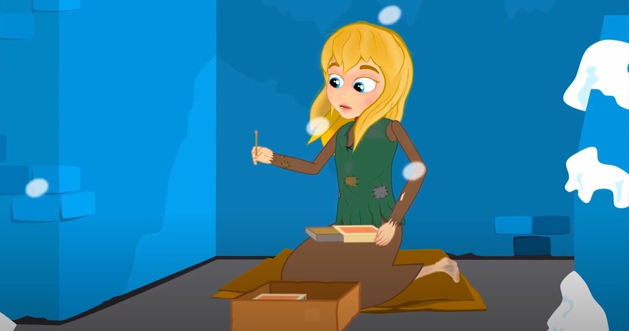 It was so terribly cold. Snow was falling, and it was almost dark. Evening came on, the last evening of the year. In the cold and gloom a poor little girl, bareheaded and barefoot, was walking through the streets. Of course when she had left her house she'd had slippers on, but what good had they been? They were very big slippers, way too big for her, for they belonged to her mother. The little girl had lost them running across the road, where two carriages had rattled by terribly fast. One slipper she'd not been able to find again, and a boy had run off with the other, saying he could use it very well as a cradle some day when he had children of his own. And so the little girl walked on her naked feet, which were quite red and blue with the cold. In an old apron she carried several packages of matches, and she held a box of them in her hand. No one had bought any from her all day long, and no one had given her a cent.