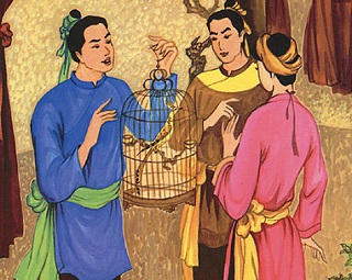 Vào một ngày xa xưa, có hai anh em con một nhà quan nọ một hôm đi chơi thấy có một nhà đạo sĩ ngồi bên vệ đường. Trước mặt đạo sĩ có đặt một cái lồng, trong có một con chim khách. Hai anh em sán lại xem và hỏi: