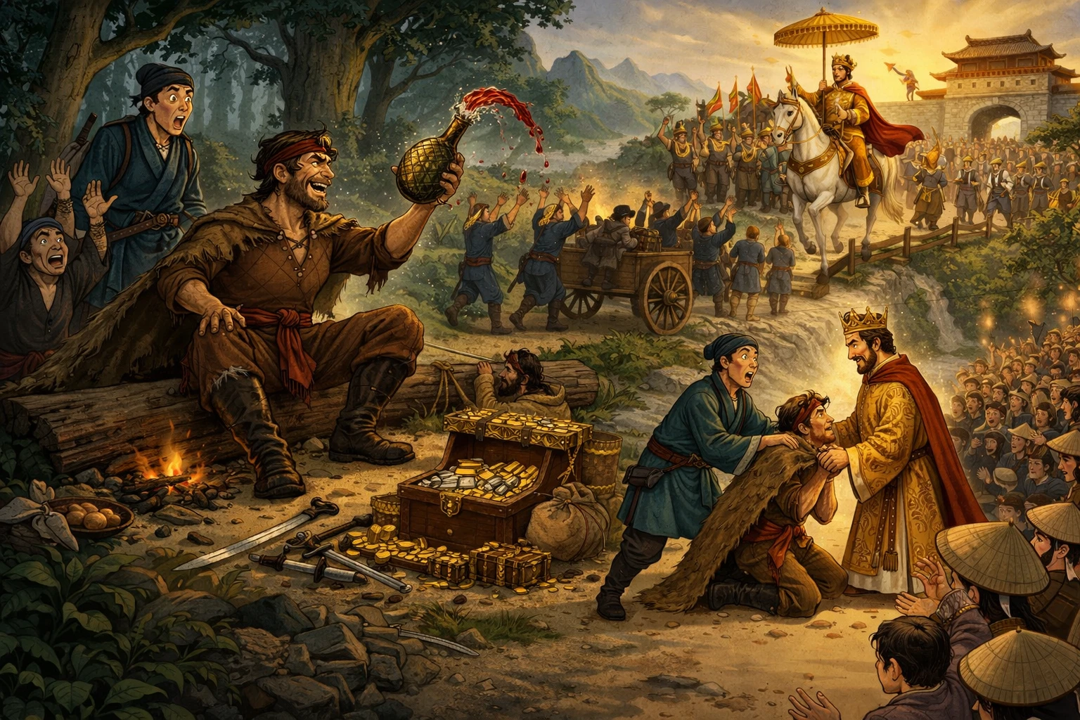 Một người lính đã chẳng sợ gì thì cũng chẳng bận tâm đến việc gì cả. Xưa có một người lính như vậy bị thải hồi. Bác ta không học được nghề gì nên không kiếm tiền được, đành đi lang thang ăn xin thiên hạ. Trên vai bác khoác chiếc áo đi mưa, chân bác đi đôi giầy ủng kỵ mã bằng da trâu, tất cả của cải chỉ còn lại có thế.