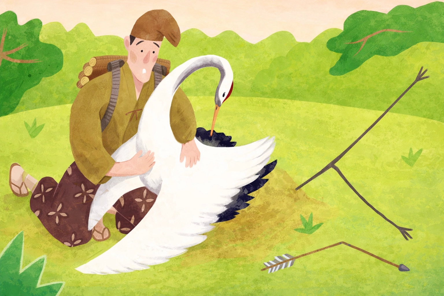 Hôm ấy, người thợ săn không được may mắn, chẳng săn được con mồi nào cả. Trên đường về nhà, ông ta tình cờ bẫy được một con chim hạc. Người thợ săn mừng rỡ, định đem về nhà làm thịt cho bữa cơm chiều thì con chim hạc bỗng ứa nước mắt van xin, nói rằng: